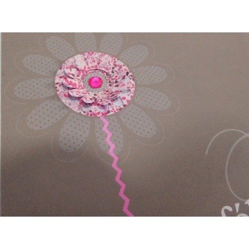 Carte originale avec fleur en relief taupe, rose et blanc sur fond avec lettrine rose poudrée
